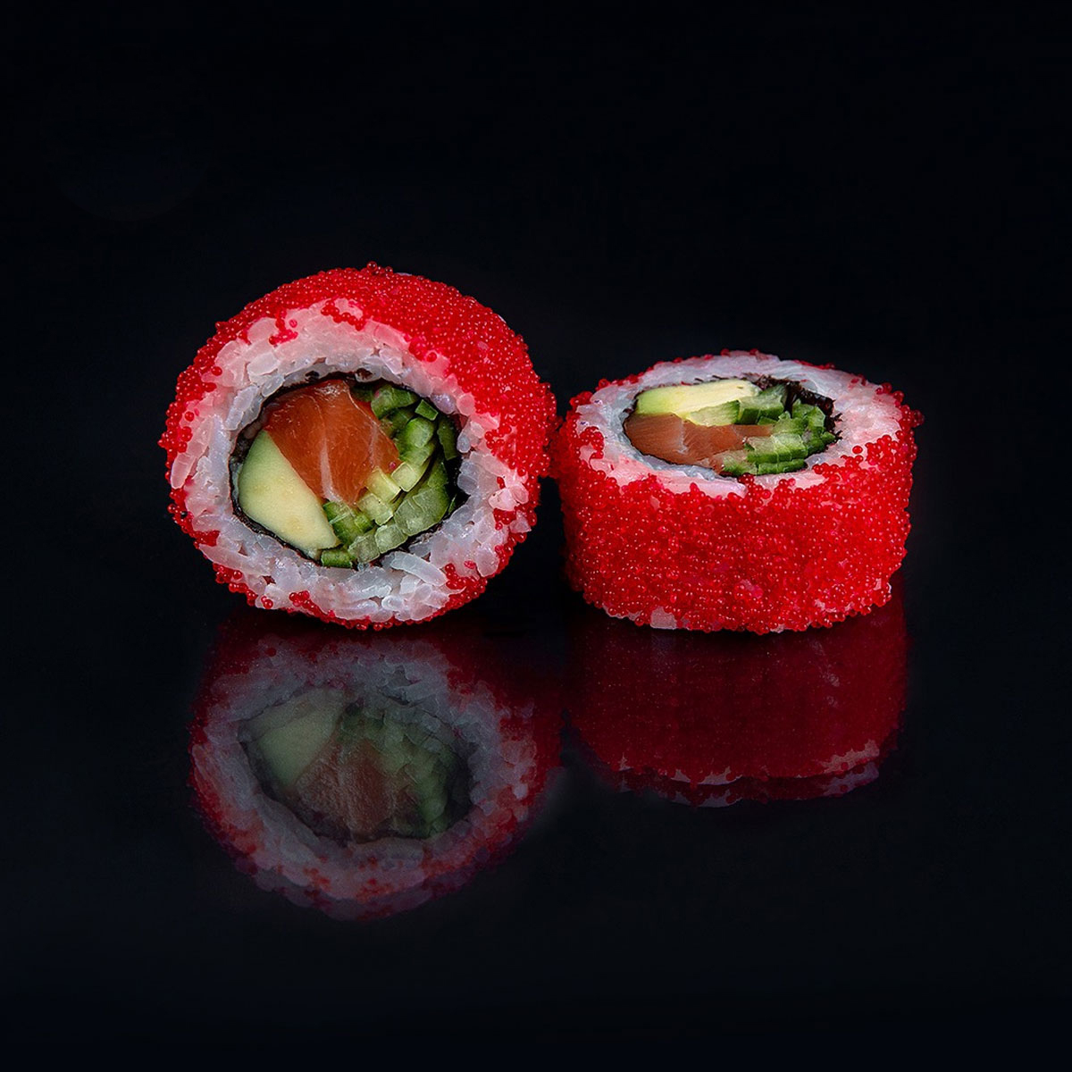 Рис, норі, лосось, ікра тобіко, авокадо, огірок.