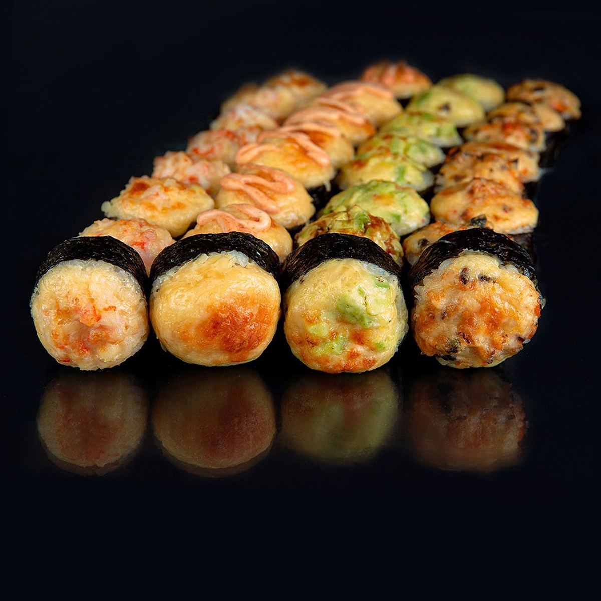 Теплий рол Лава, теплий рол Муракай, теплий рол Салмон, теплий рол Осака, імбир, васабі, соус соєвий.