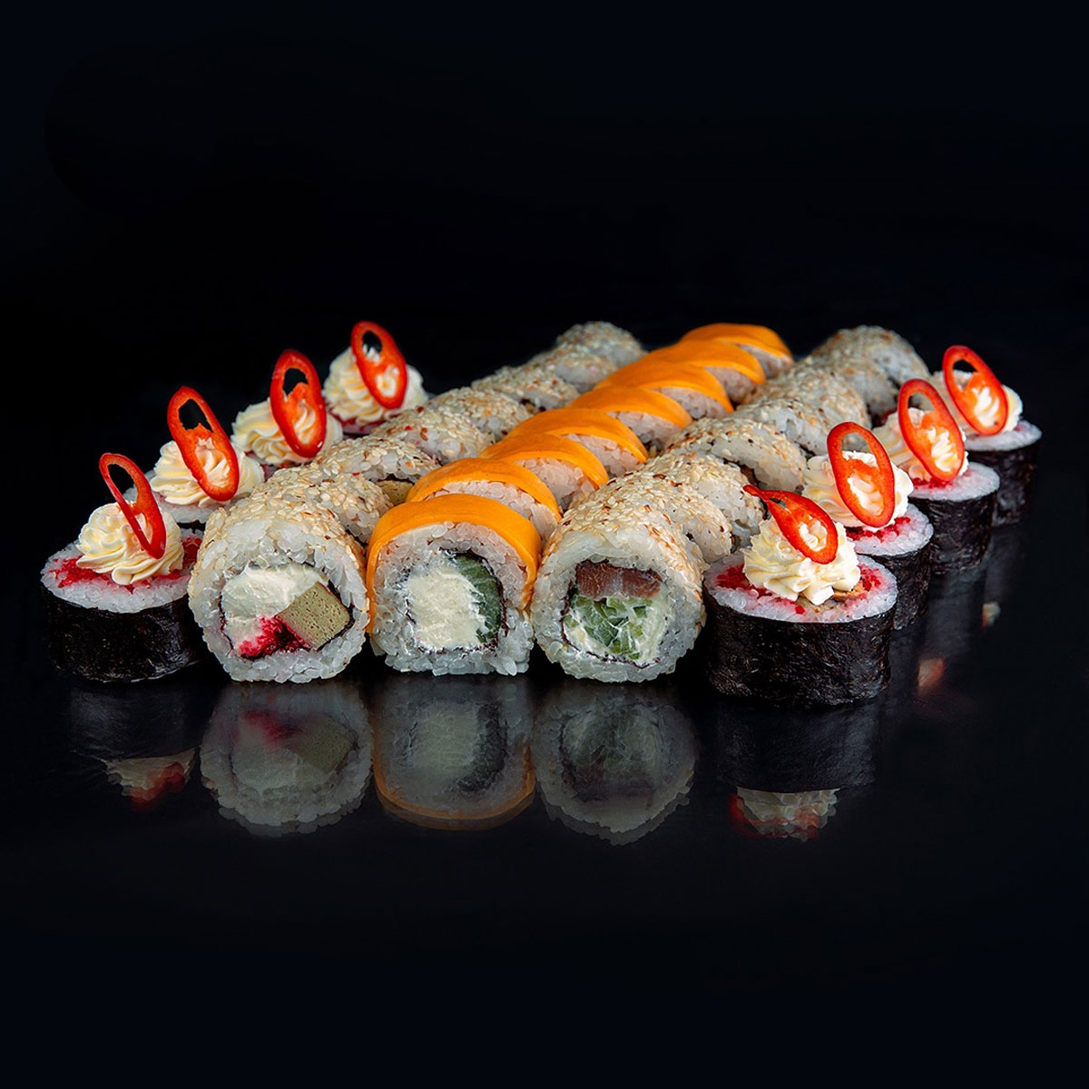 Футо мак з мідіями, Томаго рол, Лас Вегас рол, Чізу рол, імбир, васабі, соус соєвий.